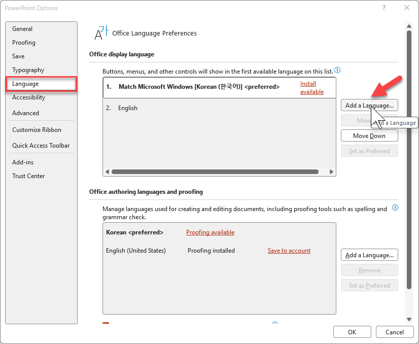 3. 왼쪽 메뉴에서 [언어(Language)] 선택하고, Office 표시 언어를 추가