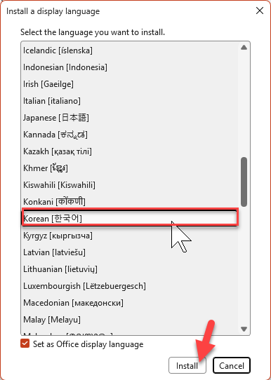 4. 원하는 언어 선택 후 [기본값으로 설정(Set as Office display language)]한 뒤 설치(Install)를 누르고 화면 지시에 따라 진행.