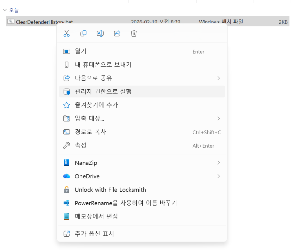 배치 파일을 다운로드한 뒤, 파일을 우클릭하여 관리자 권한으로 실행했습니다. 잠깐 명령 창이 열렸다가 닫혔고, 안내대로 재부팅을 했습니다.
