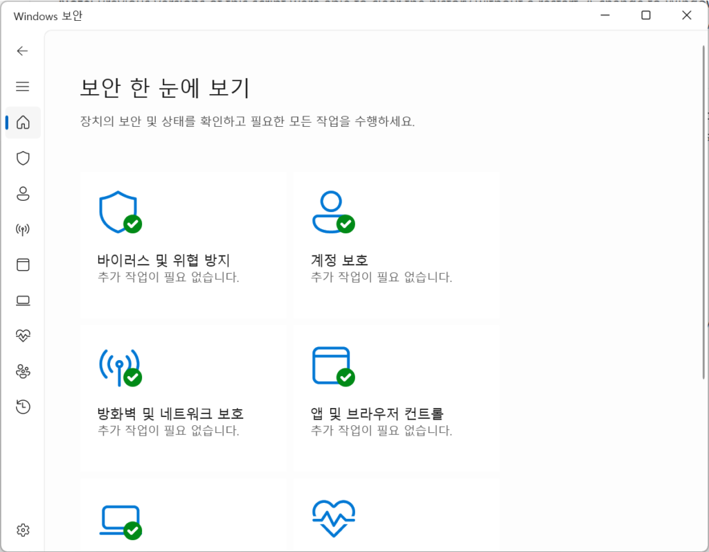 다시 Windows 보안 앱을 열어보니 X 표시가 사라졌고, “위협 서비스가 중지되었습니다”라는 메시지도 더 이상 나타나지 않았습니다. 실시간 보호 상태도 정상으로 돌아와 있었습니다.