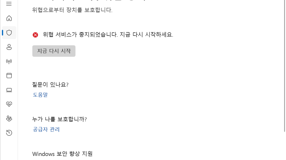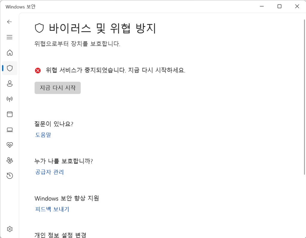 Windows 보안 아이콘에 작은 X 표시가 떠 있었고, 앱을 열어보니 “위협 서비스가 중지되었습니다. 지금 다시 시작하세요.”라는 문구가 보였습니다. 괜히 가슴이 철렁하더군요.